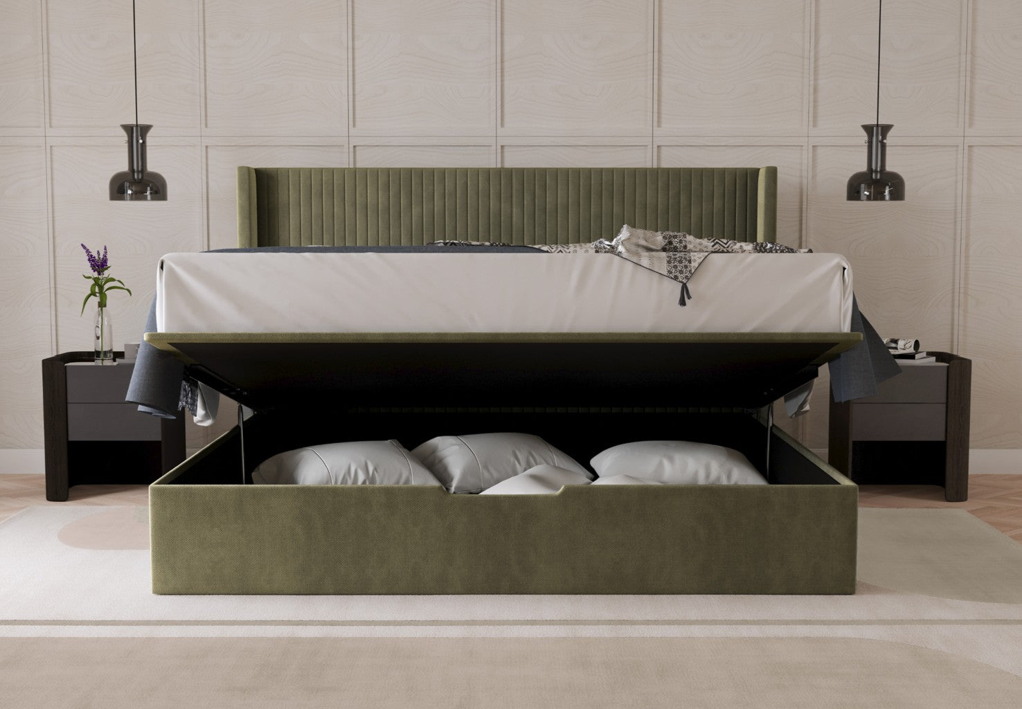 Our ottoman storage base for our bed offers the maximum amount of hidden space at 660 litres, perfect for keeping your bedroom organised and clutter‑free. The entire mattress lifts smoothly from the foot or side, revealing a deep, fully‑lined storage compartment beneath. It’s a smart, elegant solution for storing bedding, seasonal items, or anything you want neatly out of sight — all without compromising on comfort or style.